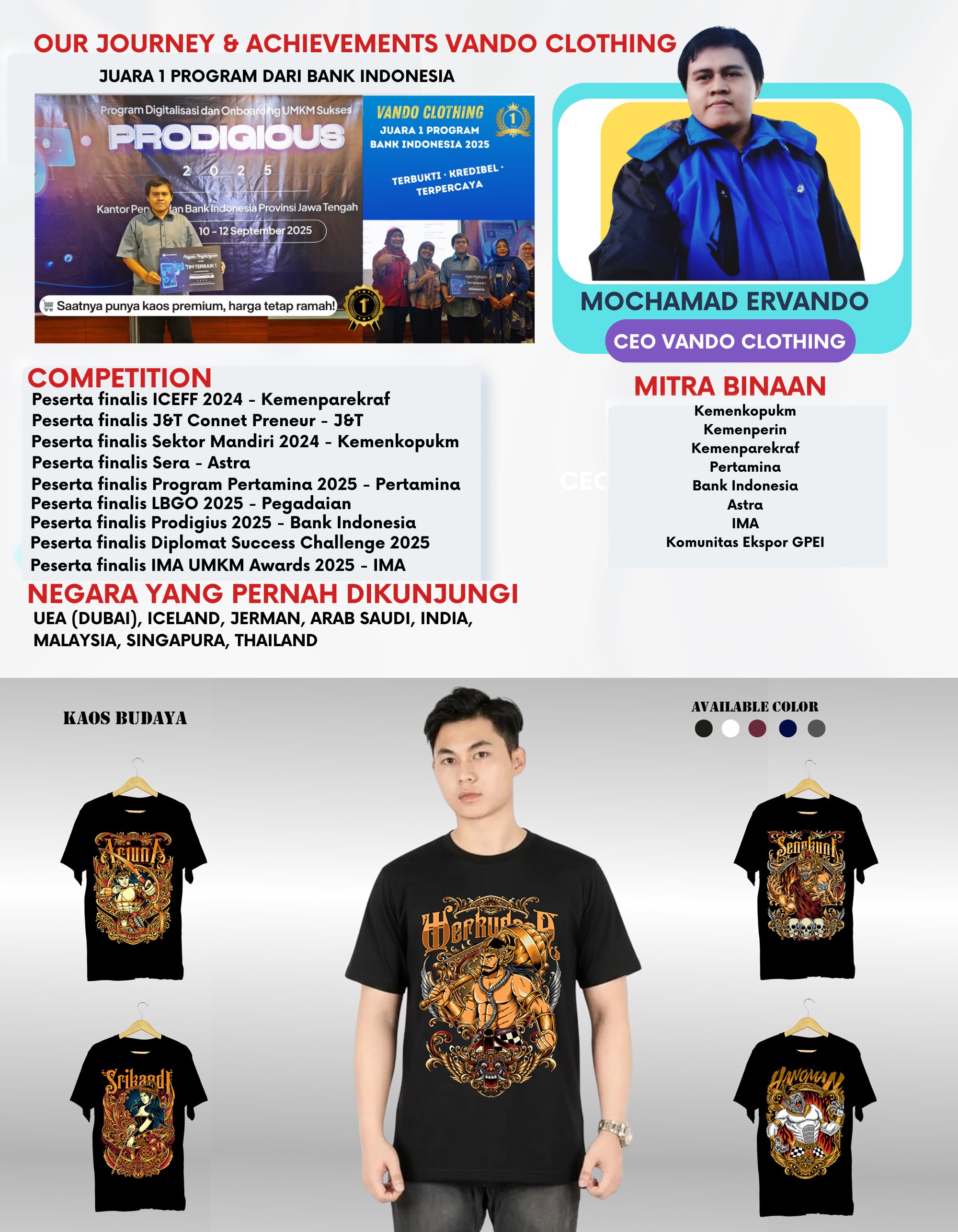 Vando Clothing adalah brand kaos asal Kudus, Jawa Tengah, yang hadir sejak 2021 untuk menghadirkan karya dengan sentuhan budaya Indonesia. Kami fokus pada kaos premium berbahan Cotton Bamboo, yang terkenal lembut, adem, ringan, dan nyaman dipakai kapan saja. Setiap desain kami mengangkat tema wayang, budaya, dan identitas Indonesia, dikemas dengan gaya modern sehingga mudah diterima generasi muda tanpa kehilangan nilai lokalnya. Vando Clothing hadir untuk menjadi pilihan kaos berkualitas yang bukan hanya enak dipakai, tetapi juga membawa cerita tentang Indonesia.